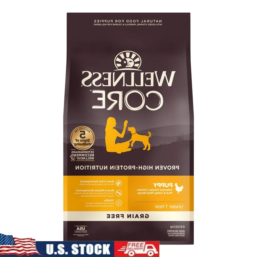 Wellness CORE Natural Grain Free Dry Dog Food Puppy Health Chicken & Turkey Recipe is healthy, 100% natural grain free dog food for puppies made with chicken, turkey, salmon oil and fruits and vegetables to help support your dog's optimal health, featuring smaller kibble size for puppies and fortified with antioxidents, probiotics, vitamins and minerals, including fish and flax omega blend for healthy skin and coat, DHA for brain and eye development and calcium and phosphorus for bones and teeth. Wellness CORE grain free dog food formulas are based on the nutritional philosophy that dogs thrive on a diet mainly comprised of meat. Each grain free, nutrient-rich formula provides high quality protein for your dog with no meat by-products or fillers, grain, corn, soy, wheat-gluten or artificial preservatives, colors or flavors.