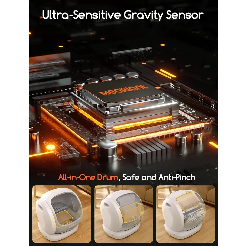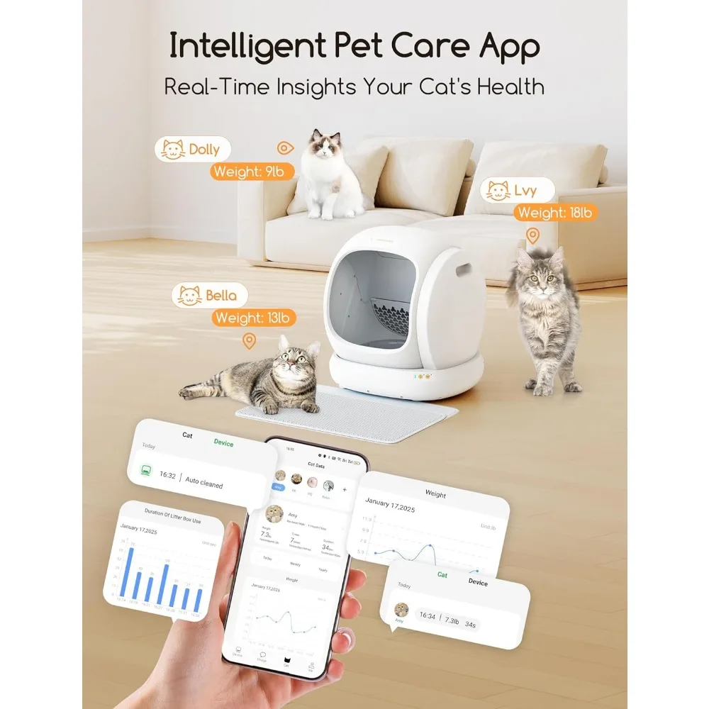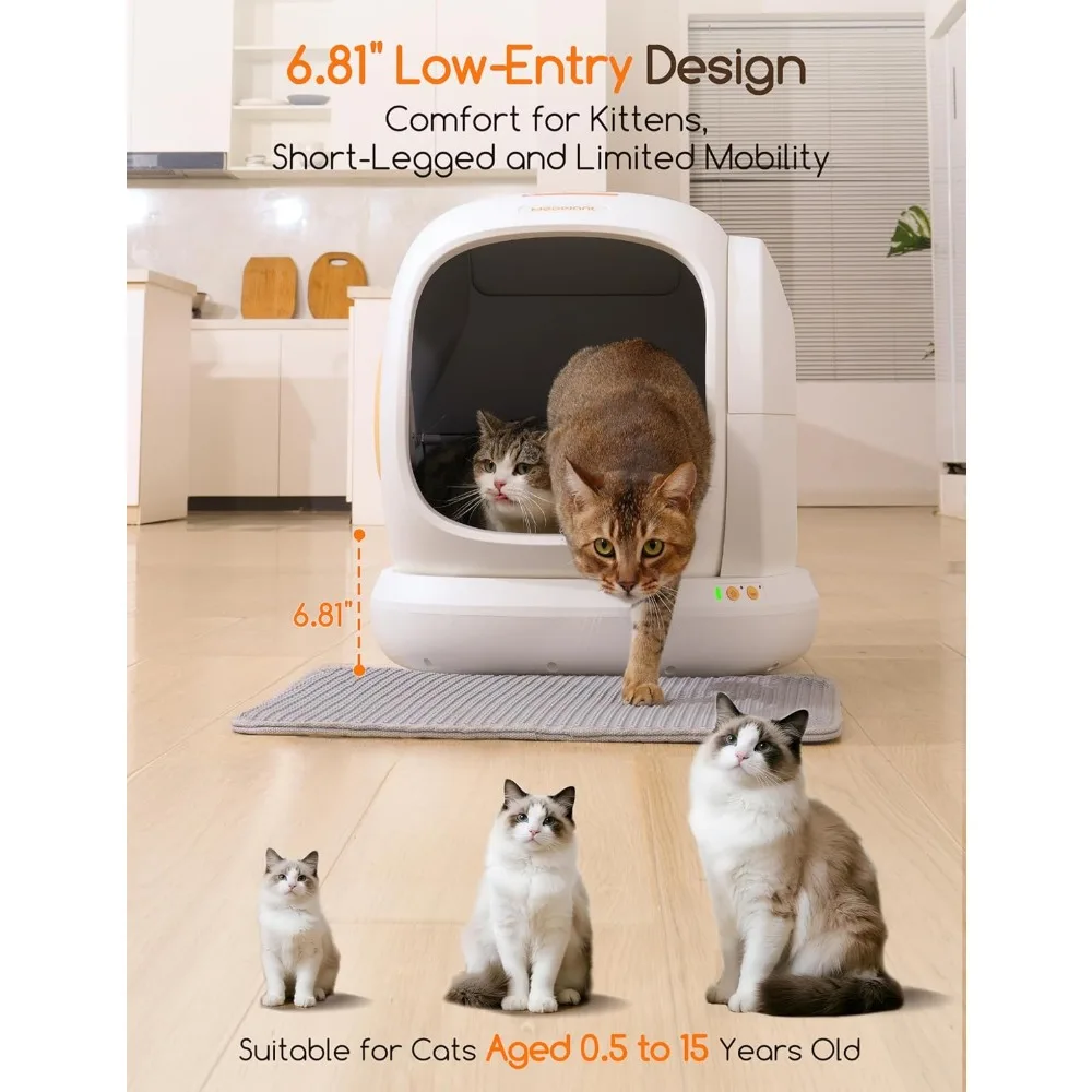 Extra Large & Open Design: The self-cleaning litter box features a roomy 75L toilet space and a large open entrance, allowing cats of all shapes and sizes (3.3 to 22 lbs) to move freely and comfortably. The 6.8-inch ultra-low entrance is especially friendly for short-legged, overweight, and senior cats Anti-Pinch & Safety Alerts: With a unique built-in anti-pinch design, this automatic litter box ensures your cat won't get caught between the litter chamber and the drum. It’s equipped with 9 high-precision sensors for weight detection, motion stopping, and safety alerts to keep your furry friend safe. Please avoid placing a mat under the litter box to prevent weight measurement errors Self-Cleaning & Compatible with All Cat Litters: After your cat leaves, the self-cleaning mechanism kicks in, automatically separating waste into an enclosed waste bin. It works well with various types of clumping cat litter (length <15mm). Just make sure to keep the litter level below the warning line APP Control & Health Monitoring: Connect the self-cleaning litter box to 2.4GHz Wi-Fi and control it from anywhere using the AIRPET app. Receive real-time updates on your cat’s weight and activity. Please note that the app supports up to 6 cats, and similar weight ranges may lead to measurement inaccuracies Odor Control & Whisper-Quiet: The automatic litter box features an odor-proof cover that effectively contains smells, while a scented gel keeps the litter box fresh. The ultra-quiet motor operates at just 38dB, ensuring a peaceful environment for you and your family. Packaging & Customer Service: Each package includes 1 automatic litter box, 1 cat litter mat, 1 litter box liner, 1 deodorizing gel, 1 adapter, and 1 instruction manual, along with a 12-month warranty. If you experience any issues or missing parts, our dedicated customer service team is ready to provide quick and reliable solutions, giving you confidence in your purchase.